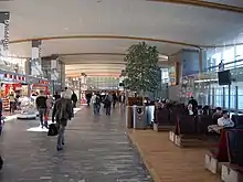 About half the airport operator's income is from retail revenue. There are 20 restaurants providing food or drink service, stores and other services including banks and a post office. In all, 8,000 square metres (86,000 sq ft) are used for restaurants, stores and non-aviation services.[57][58] The departure duty-free shop is 1,530 square metres (16,500 sq ft) and the largest in Europe. The shop is located in front of the international concourse, taking up a large part of the terminal's width.[59] The airport has attempted to funnel all passengers through the duty-free shop.[60] Signs put up to hinder passengers from walking outside the duty-free were removed after criticism in 2008.[61][62] Arriving passengers have access to a smaller duty-free shop in the baggage claim area.