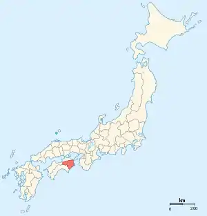 Awa Province (阿波国, Awa-no kuni) was a province of Japan in the area that is today Tokushima Prefecture on the island of Shikoku.[1] [2] Awa was bordered by Tosa, Sanuki, and Iyo Provinces. Its abbreviated form name was Ashū (阿州). In terms of the Gokishichidō system, Awa was one of the provinces of the Nankaidō circuit. Under the Engishiki classification system, Awa was ranked as one of the 35 "superior countries" (上国) in terms of importance, and one of the "middle countries" (中国) in terms of distance from the capital. The provincial capital was located in what is now the city of Tokushima.