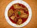 Korma is the Indian name for the technique of braising meat. It originated in Mughlai cuisine wherein lamb or chicken was braised in velvety, spiced sauces, enriched with ground nuts, cream and butter. While kormas are rich, they are also mild, containing little or no cayenne or chillies.[7] There are both vegetarian (navratan korma) and non-vegetarian (chicken, lamb, beef and fish korma) varieties of korma. Murgh Awadhi Korma is a classic from Lucknow.[8]