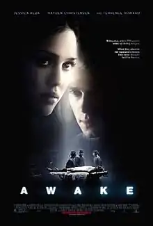 Awake is a 2007 American conspiracy thriller film written and directed by Joby Harold (in his directorial debut). It stars Hayden Christensen, Jessica Alba, Terrence Howard and Lena Olin. The film was released in the United States and Canada by Metro-Goldwyn-Mayer on November 30, 2007.