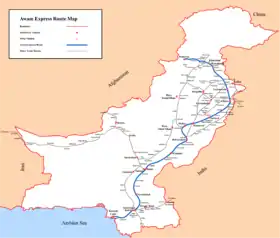 Awam Express (Urdu: عوام ایکسپریس) is a suspended passenger train operated daily by Pakistan Railways between Karachi and Peshawar. It is one of the longest continuous running passenger trains in Pakistan.[1] Pakistan Railways didn't resume its operation after suspending during the 2022 flood. The trip took approximately 33 hours and 30 minutes to cover a published distance of 1,721 kilometres (1,069 mi), traveling along the entire stretch of the Karachi–Peshawar Railway Line.