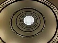 The five-storey building is constructed in brick. The building has rustication on the ground floor and arched openings along the two sides. The four upper floors stand dressed masonry and has wide pilasters between the windows. The roof features a three-bay Belvedere, topped by a balustrade, with views of Tivoli Gardens on the other side of the street. The main entrance is flanked by two wall-mounted lanterns and the keystone above the main entrance features a relief of a nude woman. The building has a central rotunda which is topped by a large, domed lantern.