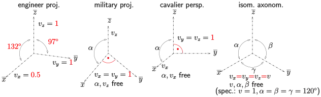 dimetric military projection: , dimetric engineering and cavalier projections: , isometric axonometry:
