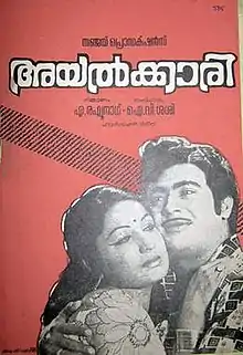 Ayalkkaari is a 1976 Indian Malayalam-language film, directed by I. V. Sasi and produced by A. Raghunath. The film stars Jayabharathi, M. G. Soman, Rani Chandra and Vincent. The film has musical score by G. Devarajan.[1][2][3]