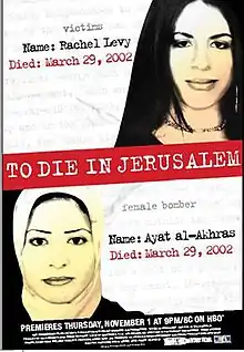 To Die in Jerusalem is a 2007 HBO documentary film about Ayat al-Akhras and her 17-year-old Israeli victim, Rachel Levy. The film documents the efforts of Rachel's mother Avigail Levy to meet with Um Samir al-Akhras, the mother of al-Akhras.[14]