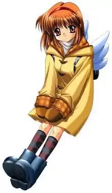 Ayu Tsukimiya (月宮 あゆ, Tsukimiya Ayu) is a fictional character and the main heroine in Key's adult visual novel Kanon, followed closely by Nayuki Minase who is the only Kanon heroine to appear with Ayu on three of the official game covers released by Key.[1] Ayu was created by Naoki Hisaya who wrote her scenario for the visual novel, and designed by Itaru Hinoue.[2] Hisaya commented on how he thought Ayu was the one character in Kanon that he felt he grasped the best, but noted it was very difficult to write her character due to Ayu being primarily energetic.[2] After Hinoue drew wings on Ayu's backpack, Hisaya suggested that they remove them due to spoiler reasons, and while Hinoue went along with it at the time, the wings were later included once again.[2]