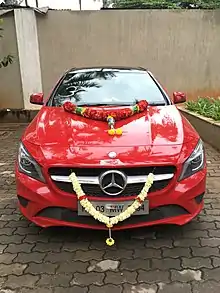 In Maharashtra, the festival is celebrated as Ayudha Puja/Shastra Puja, Vijayadashami, Navaratri and Saraswati Puja. All weapons, vehicles, agricultural equipment, machines and metal items are worshiped with leaves of the shami tree (Marathi: आपट्याची पाने/सोने), marigold flowers and the 'dhaan' that is grown during 9 days of Navaratri. Marigold flowers have a special significance on Navaratri day.[22] Saraswati Puja is performed and books, musical instruments, etc. are worshiped alongside the goddess. People perform a ritual called Simollanghan, crossing boundary of the village and collect leaves of the apta tree. The leaves signify gold. People visit each other's homes in the evening and distribute the gold (leaves) as a mark of love and respect.[23] Royal Navaratri celebrations take place at various places like Kolhapur.[24]