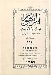 The monthly journal az-Zuhūr (Arabic: الزهور; DMG: az-Zuhūr; English: "Flowers") was published in Cairo[1] from 1910 until 1913. Altogether, 40 issues exist. The editor Anṭūn al-Ǧumayyil (1887-1948) did already participate in the publication of the Beirutian magazine Al Bashir and the Egyptian newspaper Al-Ahram.[2]