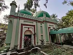 Shah Sufi Sayed Muhammad Dayem died in 1799 AD. He was buried on the southern side of the mosque. A three-domed building has been built over his grave. It is a rectangular structure, having four corner towers. This eastern wall has three arched entrances. Each doorway is placed within a projected wall, which is flanked by attached ferrets. Inside of the building, space is covered by three domes; the central dome is bigger than the others. The inner space contains other graves of the followers of Shah Sufi Muhammad Dayem. On the western side there is a verandah, probably extended in the later period.