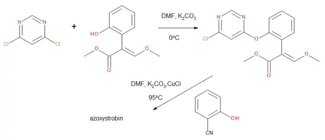 The first synthesis of azoxystrobin was disclosed in patents filed by the ICI group.[15] The sequence of the two substitution reactions allows for the synthesis of a diverse range of structural analogs via an Ullmann-type etherification between the aryl chloride of the first intermediate and a substituted phenol, thus introducing a range of structural diversity while maintaining the central strobin toxophore. The final choice of 2-cyano phenol in the second step of the synthesis was made after many other alternatives had been tested for their fungicidal properties.[11]: 704