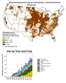 - US Geological Survey (2021-10-12). "Estimated Agricultural Use for azoxystrobin, 2019". Retrieved 2021-12-26.