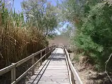 The Marsh Trail is a raised platform going through the reserve that is approximately 1.5 kilometres (0.93 mi).[12] Sections of the trail are on land going through the reeds. Halfway through the trail is the mud-brick "rustic bird hide", overlooking one of the reserve's lagoons, which is used for birdwatching.[12]