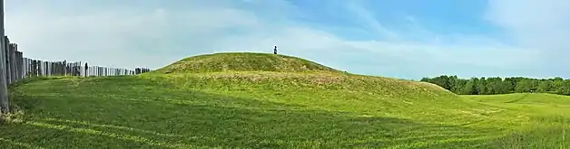 In 1850, Increase A. Lapham, an author, scientist, and naturalist, surveyed the site on behalf of the Smithsonian Institution, which was surveying ancient mounds. He described the outer stockade as being "631 feet (192 m) long at the north end, 1,149 feet (350 m) long on the west side and 700 feet (210 m) on the south side; making a total length of wall of 2,750 feet (840 m). The ridge or wall is about 22 feet (6.7 m), and from 1 foot (0.30 m) to 5 feet (1.5 m)) in height".[8] It had at least 33 square bastions at regular intervals along its length, similar in form and placement to some European fortifications, to allow defensive warriors to cover that area by shooting arrows. In addition, others were built along the secondary walls. Rather than having a gate to protect the entrance, the builders constructed the entrance so that it was camouflaged from direct view and blended in with the wall on either side.