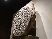 The Aztec sun stone (Spanish: Piedra del Sol) is a late post-classic Mexica sculpture housed in the National Anthropology Museum in Mexico City, and is perhaps the most famous work of Mexica sculpture.[1] It measures 3.6 metres (12 ft) in diameter and 98 centimetres (39 in) thick, and weighs 24,590 kg (54,210 lb).[2] Shortly after the Spanish conquest, the monolithic sculpture was buried in the Zócalo, the main square of Mexico City. It was rediscovered on 17 December 1790 during repairs on the Mexico City Cathedral.[3] Following its rediscovery, the sun stone was mounted on an exterior wall of the cathedral, where it remained until 1885.[4] Early scholars initially thought that the stone was carved in the 1470s, though modern research suggests that it was carved some time between 1502 and 1521.[5]