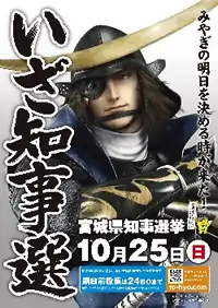 In a poll from Japanese fan magazine Newtype, Masamune was voted the 21st most-popular male anime character from the 2000s.[25] In July 2009, he took the 10th spot of the season.[26] In 2009, Masamune's image was used by Capcom to raise awareness of an election in Miyagi Prefecture, a video game first, noting in a press release that "warlord samurai turned video game sensation, Date Masamune is a household name in Miyagi Prefecture. This campaign aims to use the broad appeal Date Masamune has among the residents of the prefecture to draw attention to the election and increase the turnout of younger voters."[27]