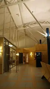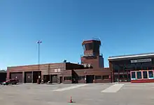 The terminal consists of a single building, with an integrated control tower, capable of handling 120 passengers per hour.[16] The facade is covered in Russian larch;[17] the focus on wood as a dominant material was common for Norwegian architecture the 1990s, and is also seen at Oslo Airport, Gardermoen (opened in 1998) and for the venues of the 1994 Winter Olympics.[6] The terminal was designed by Alta-based architect Solveig Thorsen and is shaped like an aircraft wing, similar to the terminal building at Gardermoen. There is a single gate at the airport, which prior to the installation of security control was 17 steps from the entrance.[17]