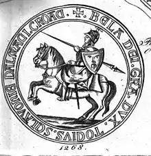King Béla's letter to Pope Innocent IV, which was written in about 1254, contains the first record of Béla's life.[3] The letter refers to a plan of the child Béla's marriage with an unnamed niece of the Pope.[3] However, the marriage never took place because of the death of Pope Innocent shortly thereafter.[3] Béla's tutor was Andrew Hont-Pázmány in 1256.[3] Berke Khan proposed an alliance to Béla IV in 1259 by offering to marry one of his daughters to a son of Béla (i.e. his namesake younger son, the only one who had not yet been married), but he refused the Khan's offer.[6]