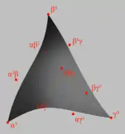 where α3, β3, γ3, α2β, αβ2, β2γ, βγ2, αγ2, α2γ and αβγ are the control points of the triangle and s, t, u (with 0 ≤ s, t, u ≤ 1 and s + t + u = 1) are the barycentric coordinates inside the triangle.[2][1]