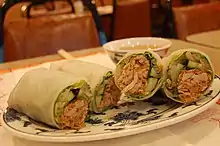 In Vietnamese cuisine, bì cuốn are pork and rice rolls. They are made from thinly shredded pork and skin, with rice, and ingredients often added are garlic sauce, lemon, sugar, chilli, pickles, and white radish and carrots.[1]