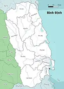 The majority of Bình Định province is covered by mountains or hills. Elevations range from 0 at the coast to around 1200 meters above sea level in An Lão district in the north-west of the province.[7] While most of the mountains as well as the highest peaks are in the west, there are mountains throughout the province, even near the coast. Most districts of Bình Định have a topography that is a mix of mountains or hills and lowlands. The districts of An Lão in the north-west, Vĩnh Thạnh in the west, and Vân Canh in the south-west are mostly mountainous. All other districts have some lowlands.