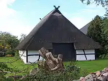 The church dates to the early 14th century. It is triple-aisled and made of granite and fieldstone, the west tower is wooden. The oldest parts of the carved altar date to the 15th century. The ambry is in the shape of a pinnacle turret.