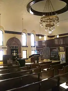 As originally built, the bimah was in the center of the sanctuary, but in an earlier modernization of the building, the central bimah was removed. The woodwork around the Torah ark is original, as is the 7-branched menorah in front of the ark. The ark doors and interior, however, are not original.