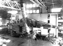 The four bomb bays could carry up to 87,200 pounds (39,600 kg) of bombs, more than 10 times the load carried by the World War II workhorse, the Boeing B-17 Flying Fortress, and substantially more than the entire B-17's gross weight.[27] The B-36 was not designed with nuclear weapons in mind, because the mere existence of such weapons was top secret during the period when the B-36 was conceived and designed (1941–46). Nevertheless, the B-36 stepped into its nuclear delivery role immediately upon becoming operational. In all respects except speed, the B-36 could match what was arguably its approximate Soviet counterpart, the turboprop-powered Tu-95, which began production in January 1956 and is still in active service as of January 2023.[28] Until the B-52 became operational, the B-36 was the only means of delivering the first generation Mark 17 hydrogen bomb,[29] 25 ft (7.6 m) long, 5 ft (1.5 m) in diameter, and weighing 42,000 lb (19,000 kg), the heaviest and bulkiest American aerial nuclear bomb ever. Carrying this massive weapon required merging two adjacent bomb bays.