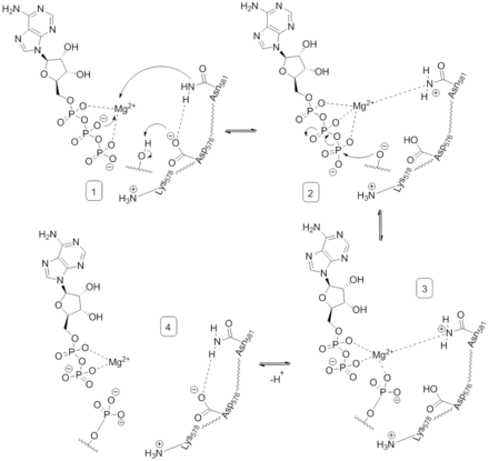 To effectively catalyze protein phosphorylation via the bimolecular substitution of serine and threonine residues with ADP as a leaving group, B-Raf must first bind ATP and then stabilize the transition state as the γ-phosphate of ATP is transferred.[16]