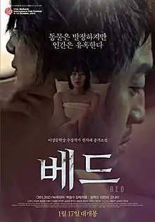 Bed is a 2012 South Korean erotic romance film directed by Park Chul-soo, based on the short story of the same name by novelist Kwon Ji-ye. Starring theater actors Jang Hyuk-jin, Lee Min-a and Kim Na-mi, the film is an erotic relationship drama about three people. B, whose life "begins on the bed and ends on the bed", has an affair with married woman E and later, after she breaks up with him, he marries D, a single mother and career woman. The film features frequent full-frontal nudity.[1]