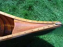 Stem Morris canoes display a “splayed stem”, 3 inches or so in width at the inboard end and made of cedar. The splayed end of the stem has a squared-off appearance. Some canoes built by the Kennebec Boat and Canoe Company have an identical cedar stem, possibly because Kennebec founder George Terry hired men from Morris.[12] The Rhinelander Boat Company employed a splayed hardwood stem on its boats as well as its canoes.