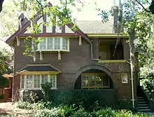 He was in partnership with J. W. H. Lake from 1908. Waterhouse built up a substantial practice, particularly in the Cremorne-Neutral Bay area. Until the mid-1920s his domestic architecture drew on the Arts and Crafts Movement, with steeply gabled roofs, extensive use of sandstone in the basements, shingle tiles and roughcast exterior wall surfaces. Thereafter his style showed a strong Mediterranean influence, a notable example being May Gibbs's house, Nutcote, with textured stucco walls and symmetrical, twelve-paned, shuttered windows.[2] Waterhouse had a gift for composing shapes, textures, solids and voids into seemingly casual, informal architecture; he was particularly aware of the needs to build in scale and sympathy with people. Thus his houses have a comfortable and warm character, without fuss or strain, free of unnecessary detail.[3] Waterhouse in his early architecture followed the precepts of the English Arts and Crafts movement and his work has a close affinity to that of Charles Voysey, Baillie Scott and Charles Rennie Mackintosh.[3] A typical Waterhouse residence featured asymmetrical, picturesque massing, strongly expressed roofs, usually with dominant gables; porches, balconies and verandahs; and at least one facetted oriel or bay external wall finish, together with areas of timber shingling or tile-hanging. Inside, the main rooms displayed timber wainscoting on the walls and heavy timber beams below the ceilings.[3] He continued to design in this manner until the early 1920s. In his later years Waterhouse designed residences in the Spanish Mission Style.
