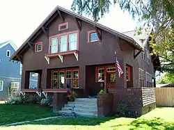 It is a large Bungalow-style house with both front-facing and cross gables. It is unusual for its size and for its shingle siding. The Idaho State Historical Society inventory of the house states: "The house is massive for a bungalow, with a thirty-six-by-fifty-four-foot perimeter and an additional cross gable which allows a full four bedrooms and a sleeping porch to be included under the low gabled roof of the upper half story."[2]