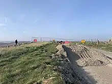 In February 2019, a section of the road between Dubmill and Mawbray was closed "indefinitely" after an emergency inspection revealed significant coastal erosion of over two metres in a matter of weeks. The road was deemed to be "too close to the sea" by inspectors, and emergency funding totalling £281,000 was allocated to shore up the road and prevent damage. A license was granted by the Marine Management Organisation to install new rock armour coastal defences.[28] Sue Hayman, the MP for the constituency of Workington in which the B5300 road is located, called for an urgent meeting with DEFRA officials, believing that any further delay in installing the new coastal defences could leave the road irreparably damaged.[29] The closure had a serious effect on local businesses and charities.[30] Several licenses were required in order for work to be able to begin, including a European Protected Species License. This license was eventually granted by Natural England on the basis that an ecologist would be on-site for the duration of the work. Protecting the Site of Special Scientific Interest and the local natterjack toad population was behind the delay, and the license was finally granted on the 17th of April 2019. Work commenced on the 23rd of April,[31] with the road expected to re-open in July 2019.[32] The road re-opened on the 20th of June 2019,[33] after a section of rock armour 120m long was installed. The closed section of the road was also resurfaced. After the road was re-opened, local MP Sue Hayman called for "urgent action" over the future of the road. A meeting between Hayman and the government was delayed, in part due to that year's Conservative Party leadership election. Parts of the route of the B5300 are designated as being in managed retreat, further confusing the road's future.[34]