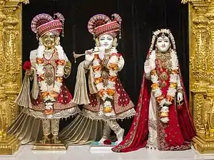 Within the mandir, murtis (sacred images of the deities) have been ritually installed. The central shrine holds the murti of Swaminarayan, with Gunatitanand Swami to his left, together worshipped as Akshar-Purushottam Maharaj. Similarly, other shrines hold murtis of other Hindu deities, such as Radha Krishna, Shiva Parvati, Sita Ram, Hanuman, Ganapati and the lineage of BAPS gurus, who are Swaminarayan's spiritual successors.[3][4] Daily darshan and participation in the Aarti ritual are welcomed by the mandir.[5]