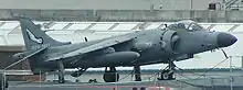 The British Aerospace Sea Harrier is a naval short take-off and vertical landing/vertical take-off and landing jet fighter, reconnaissance and attack aircraft. It is the second member of the Harrier family developed. It first entered service with the Royal Navy in April 1980 as the Sea Harrier FRS1 and became informally known as the "Shar".[2] Unusual in an era in which most naval and land-based air superiority fighters were large and supersonic, the principal role of the subsonic Sea Harrier was to provide air defence for Royal Navy task groups centred around the aircraft carriers.