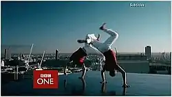 | Capoeira | 29 March 2002 – 7 October 2006 | Filmed against the London skyline above the now–demolished tower of International Press Centre on Shoe Lane in Holborn, it shows two performers, Mestre Poncianinho and Contra-Mestre Casquinha, doing Capoeira, a Brazilian martial art. The camera circles around them throughout its duration, and they are also dressed in red and white. An alternative edit, which joins the action a few seconds earlier than the standard version, was used in Wales and Scotland. This ident was commonly seen introducing the lunchtime news on weekdays. This was the first ident in the new set to be shown on television at 9am on 29 March 2002. |