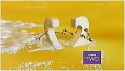 | Logo | 19 November 2001 – 18 February 2007 | The 2 stands vigil at the top of the screen surveying the landscape before noticing that the BBC Two logo isn't there, instead being occupied by a white square. The helpful 2 then moves over, and uses its mechanical arms to lift and flip over the BBC Two logo, before retreating to the top of the screen. On the launch of BBC Three or Four, it rotates to the BBC Three (or Four) logo. |