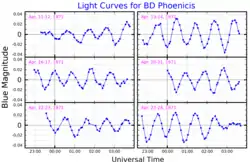 BD Phoenicis is a Lambda Boötis star, an uncommon type of peculiar stars that have very low abundances of iron-peak elements. In particular, BD Phoenicis has near-solar carbon and oxygen content, but its iron abundance is only 4% the solar value.[1] BD Phoenicis is also a pulsating variable of Delta Scuti type, varying its apparent magnitude between 5.90 and 5.94.[3] A study of its light curve detected seven pulsation periods that range from 50 to 84 minutes, the strongest one having a period of 57 minutes and an amplitude of 9 milli-magnitudes. Pulsations are common among Lambda Boötis star and seem to be more common than on normal main sequence stars of the same spectral type.[1]