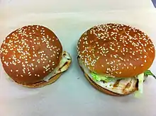As part of the forty-fifth anniversary of its Whopper sandwich in 2002, BK introduced an updated version of the sandwich called the Chicken Whopper and added a smaller version called the Chicken Whopper Jr. sandwich, along with a new Caesar salad sandwich topped with a Chicken Whopper filet.[11][12][13] The introduction of the Chicken Whopper represented the company's first move to extend the Whopper brand name beyond beef-based sandwiches since the original Whopper's introduction in the 1950s.[14] The sandwiches featured a whole chicken breast filet, weighing either 4.7 oz (130 g) for the larger sandwich and a 3.1 oz (88 g) for the Jr., mayonnaise, lettuce, and tomato on a sesame seed roll.[15] A newly reformulated low fat mayonnaise was introduced in conjunction with the new sandwiches.[16] Along with the company's new BK Veggie sandwich, The Chicken Whopper Jr. version of the sandwich was lauded by the Center for Science in the Public Interest as being one of the best nutritionally sound products sold by a fast food chain. Still, the CSPI decried the rest of the Burger King menu as being vastly unhealthy.[17]