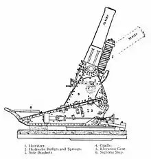This gun was designed as a siege howitzer firing a special 122 pounds 9 ounces (55.59 kg) howitzer shell. It was designed to be fired from a static siege platform, with wheels removed, for accurate long-range shooting. When fired mounted on its normal wheeled travelling carriage, which had become standard practice for modern medium artillery, its range and accuracy diminished due to limited elevation and also lack of a modern recoil mechanism.