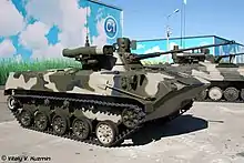 - BMD-2M – BMD-2 modernisation, with the original turret replaced by the Bereg combat module. The main armament is similar to that of the non-upgraded BMD-2, with a 2A42 cannon with 300 rounds, and a PKTM machine gun. However, the original missile system is replaced by two launchers for 9M133 Kornet missiles. A new fire-control system is installed, with a new sight including a thermal channel, a laser rangefinder, a new ballistic computer coupled with a meteorological sensor and with automatic target tracking, and a new stabiliser. A new radio is installed, and three smoke grenade launchers are added.[10]