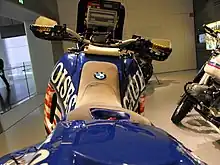 The R 80 G/S (G for Gelände "offroad" in German S for Straße "street") was the first large displacement multisport bike on the market. The G/S was fitted with a 797.5 cc (48.67 cu in) BMW type 247 engine, which is a flat-twin (boxer) sometimes known as an airhead. The engine, which was fitted into an R65 frame,[2] was a modified version of that fitted to the R 80/7, featuring Nikasil cylinders, electronic ignition and a lighter flywheel.[2] At the rear the bike had the new "monolever," a combined single-sided swingarm and drive shaft, with the rear damping provided by a single shock absorber. The monolever was stiffer and lighter than the design fitted to previous models, and was subsequently fitted to other BMW motorcycles. It was a sealed suspension lever with the driveline inside the lever filled with oil to lubricate the shaft and parts.[2] The single sided swing arm enabled the rear wheel to be removed easily with the bike on the center stand. It differs from other BMW road bikes of the same era due to its lighter weight, longer suspension travel, and large 21 inch front wheel.[3] The bike gained popularity with adventure-seeking travellers after having won the Paris-Dakar rally several times. BMW offered numerous optional parts including a 32-litre (7.0 imp gal; 8.5 US gal) fuel tank with Gaston Rahier's signature, a solo seat, stainless exhaust and a larger battery meaning that for the first time a true adventure travel motorcycle could be purchased directly from a manufacturer. The market it created spawned many aftermarket motorcycle accessories, such as larger fuel tanks and panniers.[3]