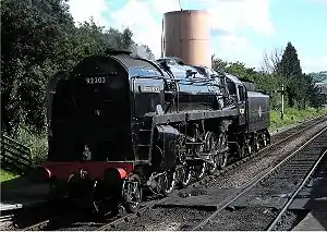 No. 92203 was built by Swindon and delivered on 6 April 1959.[5] When withdrawn in November 1967[5] after a working life of less than nine years, it was working the heavy iron ore trains out of Bidston Dock, Birkenhead to Shotwick Shotton steelworks, and worked the last steam-hauled ore train in November 1967.[6][7][8] The locomotive was purchased straight from BR by the artist David Shepherd for £3,000[9] and moved to the Longmoor Military Railway. He named her Black Prince, a name never carried by 92203 in British Railways service. On closure of the LMR, 92203 moved to Eastleigh Depot and then, in 1973, to the East Somerset Railway, where it was based until 1998.