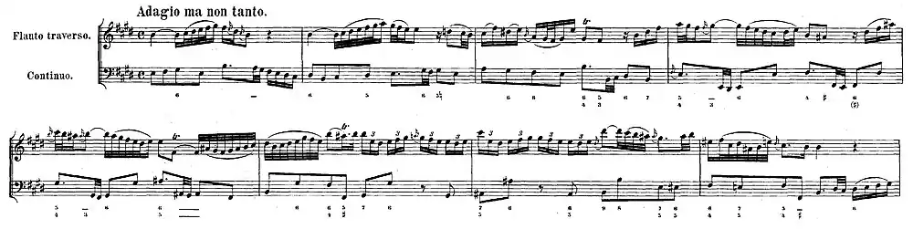 The Sonata in E major for flute and basso continuo (BWV 1035) is a sonata for transverse flute and figured bass composed by J. S. Bach in the 1740s. It was written as the result of a visit in 1741 to the court of Frederick the Great in Potsdam, where Bach's son Carl Philipp Emanuel had been appointed principal harpsichordist to the king the previous year. It was dedicated to Michael Gabriel Fredersdorf, the king's valet and private secretary, who, like the king, was an amateur flautist.[1][2]