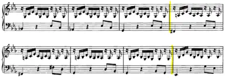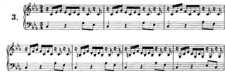 The composition is written on the next two pages, on systems of two staffs, with a soprano clef for the upper staff, and a bass clef for the lower staff. Although, in the first half of the 18th century, a tablature notation was common for lute compositions, Kellner thus wrote the Prelude down in a notation which at the time was customary for keyboard compositions.[10] The Prelude can be performed as well on a keyboard instrument as on a lute.[11][12][13] Kellner is known as organist and keyboard performer: his copy of BWV 999 is the only extant instance of him taking an interest in a composition for lute.[11]