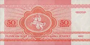 50 cop | 105 × 53 mm | Orange-pink | Image of sciurus | Pahonia ("The Chase") | 25 May 1992 | 1 January 2001 | 31 December 2000 | |