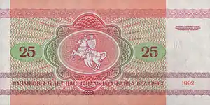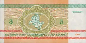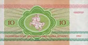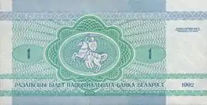 From the collapse of the Soviet Union until May 1992, the Soviet ruble circulated in Belarus alongside the Belarusian ruble. New Russian banknotes also circulated in Belarus, but were replaced by notes issued by the National Bank of the Republic of Belarus in May 1992.[4] The first post-Soviet Belarusian ruble was assigned the ISO code BYB and replaced the Soviet currency at the rate of 1 Belarusian ruble = 10 Soviet rubles. It took about two years before the ruble became the official currency of the country.[4]