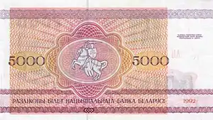 Rbls 5,000 | 105 × 60 mm | Red | Trinity Hill in Minsk | Pahonia | 7 April 1994 | |||