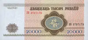 Rbls 20,000 | 150 × 69 mm | Olive-yellow | National Bank of the Republic of Belarus | Pahonia | 28 December 1994 | |||