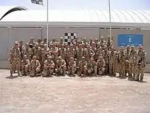 B Battery deployed to Iraq in April 2004 and was tasked with Security Sector Reform (SSR). The Battery was initially based at one of Saddam Hussein’s former Palaces in the south of Basra with Sahagun Troop tasked with mentoring the Tactical Support Unit (TSU) and being based at the Old State Building (OSB) in the centre of the city. B Battery moved location several times during the tour but spent the last two months back at the Palace providing escorts for the Provincial Support Liaison Team (PSLT). This team was part of the G5 support to assist the locals with the rebuilding of Iraq. On 28 September, whilst escorting one of these teams to a housing project in the north of Basra, the patrol was ambushed with small arms and rocket propelled grenades (RPG). The lead Snatch Land Rover was hit by a RPG which killed the driver Gunner David Lawrence and fatally wounded the commander, Corporal Marc Taylor, one of the Royal Electrical and Mechanical Engineers who was serving with the Battery as a team commander. The Battery finished the tour in late October and returned to the UK. After a period of leave, B Battery then prepared itself to deploy to Kenya to support the Royal Ghurkha Rifles (RGR), on Ex GRAND PRIX in the summer of 2005. After converting to the Light Gun, the Battery had a successful exercise. Digitisation followed in 2006 with the Regiment converting from the CLANSMAN radio system to the BOWMAN system. This required extensive re-training however proved successful following a regimental exercise. B Battery deployed to BATUS supporting 2 Royal Welsh in August 2005 and whilst there was warned off for Op TELIC 10 in 2007. On return from the exercise in Canada, the Battery put the guns into the Whole Fleet Management (WFM) programme and was selected to represent the Gunners for the Royal Regiment of Artillery Memorial Service at Hyde Park Corner.[2]